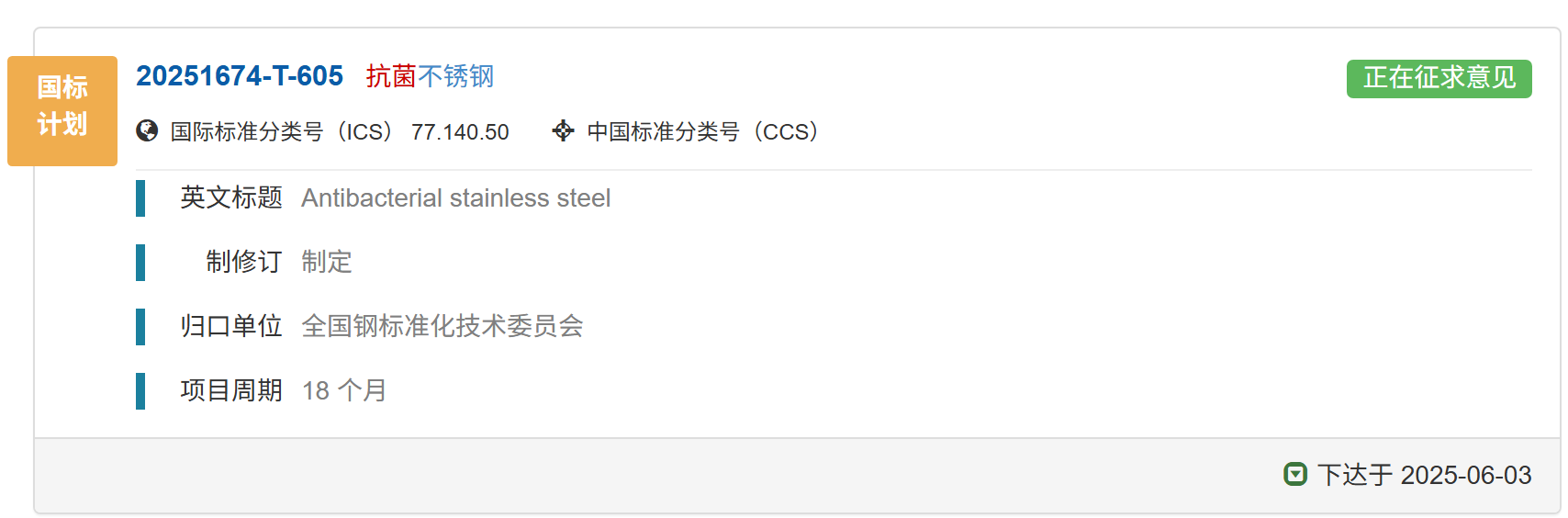 國家標(biāo)準(zhǔn)《抗菌不銹鋼》正在征求意見中,歡迎報名成為參編單位并提出修改意見和建議。01 國家標(biāo)準(zhǔn)計劃《抗菌不銹鋼》已下達國家標(biāo)準(zhǔn)計劃《